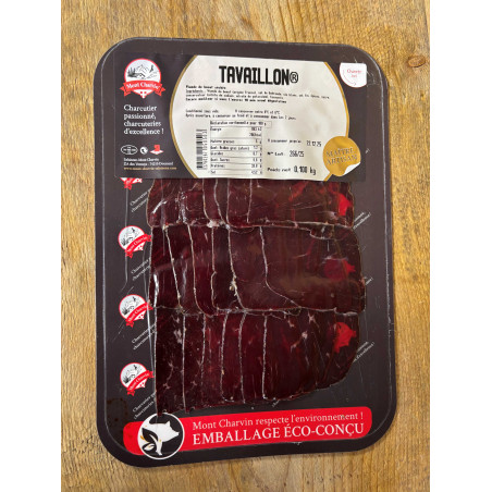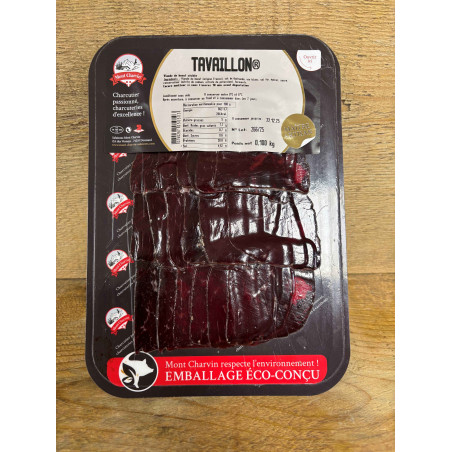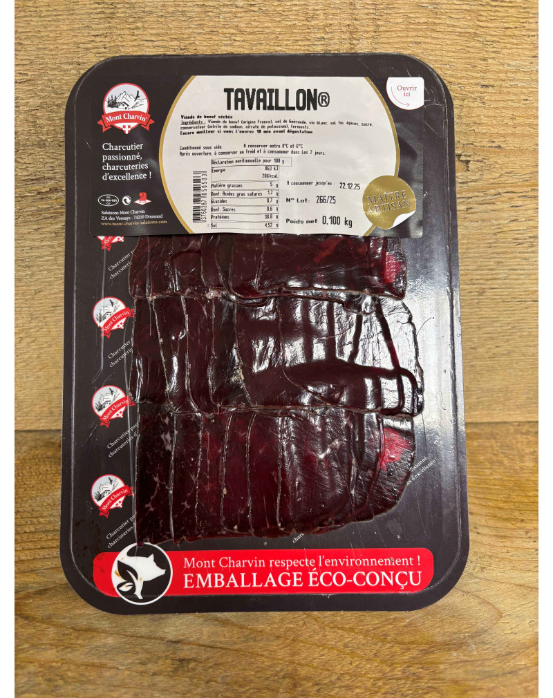 Le Tavaillon est une spécialité à base de maigre de bœuf séché, mariné lentement à la gnôle de prune. Fabriqué par Mont Charvin, maître-artisan charcutier, installé à Doussard en Haute-Savoie. Sans colorant, sans polyphosphate, sans ascorbate ni lactose ! Une idée originale à découvrir en toutes occasions : apéritif, raclette, sur le pouce…