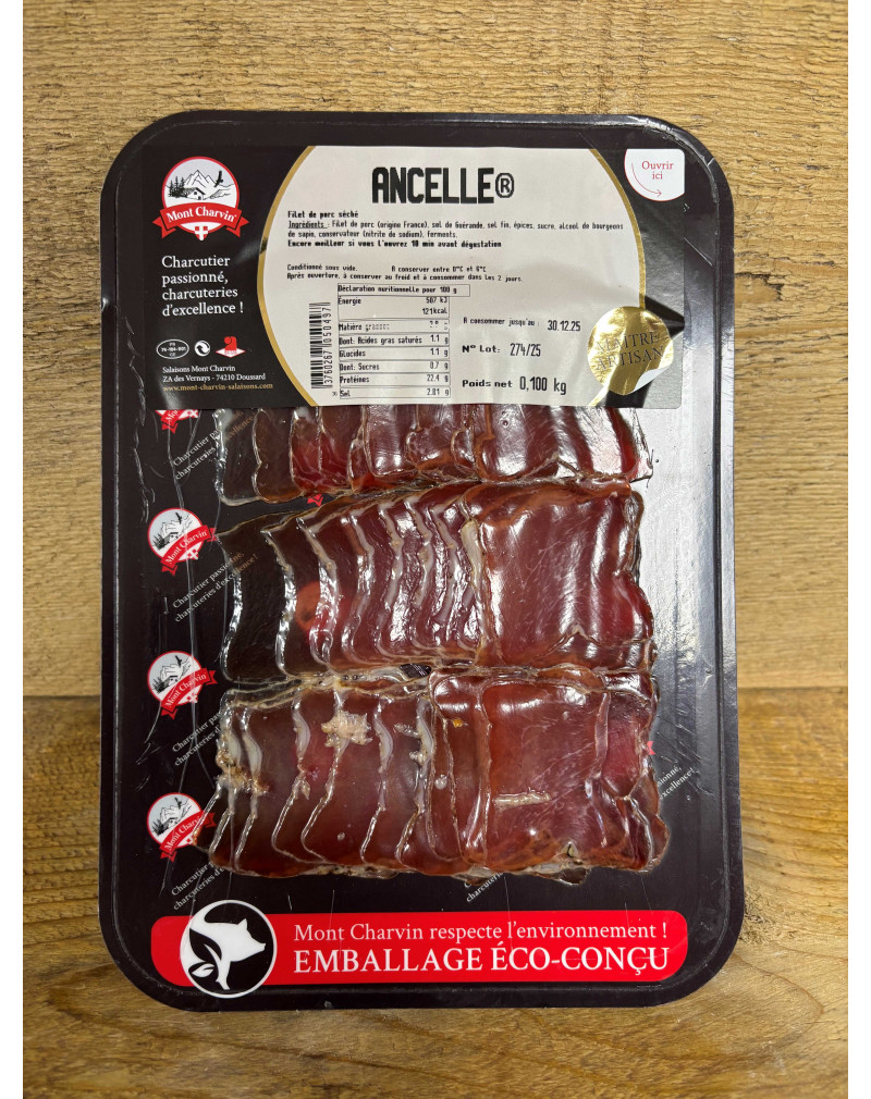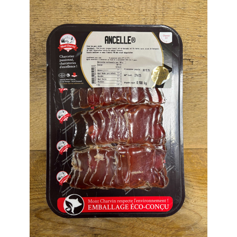 L'Ancelle est une spécialité à base de filet de porc séché, au goût boisé, mariné dans une infusion de bourgeons de sapin et séchée à l’air des Alpes. Cette salaison est fabriquée par Mont Charvin, maître artisan charcutier, installé à Doussard en Haute-Savoie. Sans colorant, sans polyphosphate, sans ascorbate ni lactose ! L'Ancelle se déguste en toutes occasions : apéritif, raclette, sur le pouce...